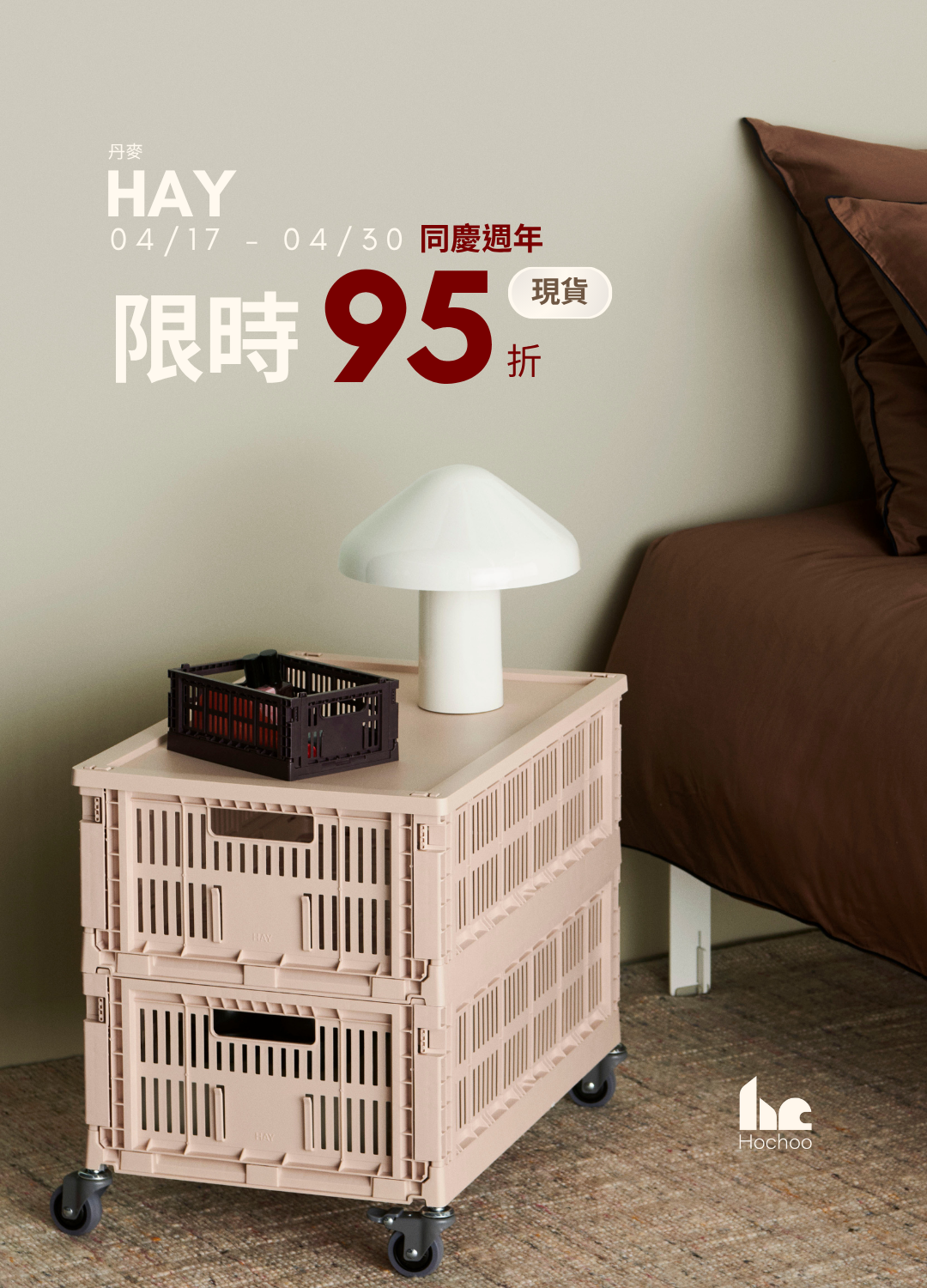 品牌 HAY 周年慶活動|Happy Birthday To HAY | 歡慶HAY來台兩周年,期間限定現貨商品限時折扣 「免等待、限時現貨」立即 95 折 活動詳情活動時間 | 2026.04.17 - 2026.04.30活動地點 | 官網與新生門市 < 點擊連結 搶先採購 > (大型家具/燈飾、偏鄉遠地區運費另計) | 優惠活動注意事項 |1.此活動適用官網消費與Hochoo好萩家居門市。 2.本活動優惠不得與其他專案或折扣活動併用、本活動為限時優惠,恕不接受補登折扣或活動結束後追溯優惠。 3.優惠活動不得與白金會員&尊榮會員之各級別優惠併用(系統將自動判別,以較優惠者進行折抵)。 4.優惠活動不得搭配使用購物金及任何優惠券。 5.優惠活動不得與任何專案併用。 6.優惠判別以結帳時間為準,如結帳後有退款、銷貨等情形其優惠視同無效。 7.此活動不開放與其他活動優惠併用。 8.參與此活動,亦代表您已閱讀活動詳細內容與同意活動內容。 9.如有未盡事宜,Hochoo 保留隨時修改、變更、取消之權利,亦有權對本活動作出解釋或決定,並於活動網頁公告後實施。
