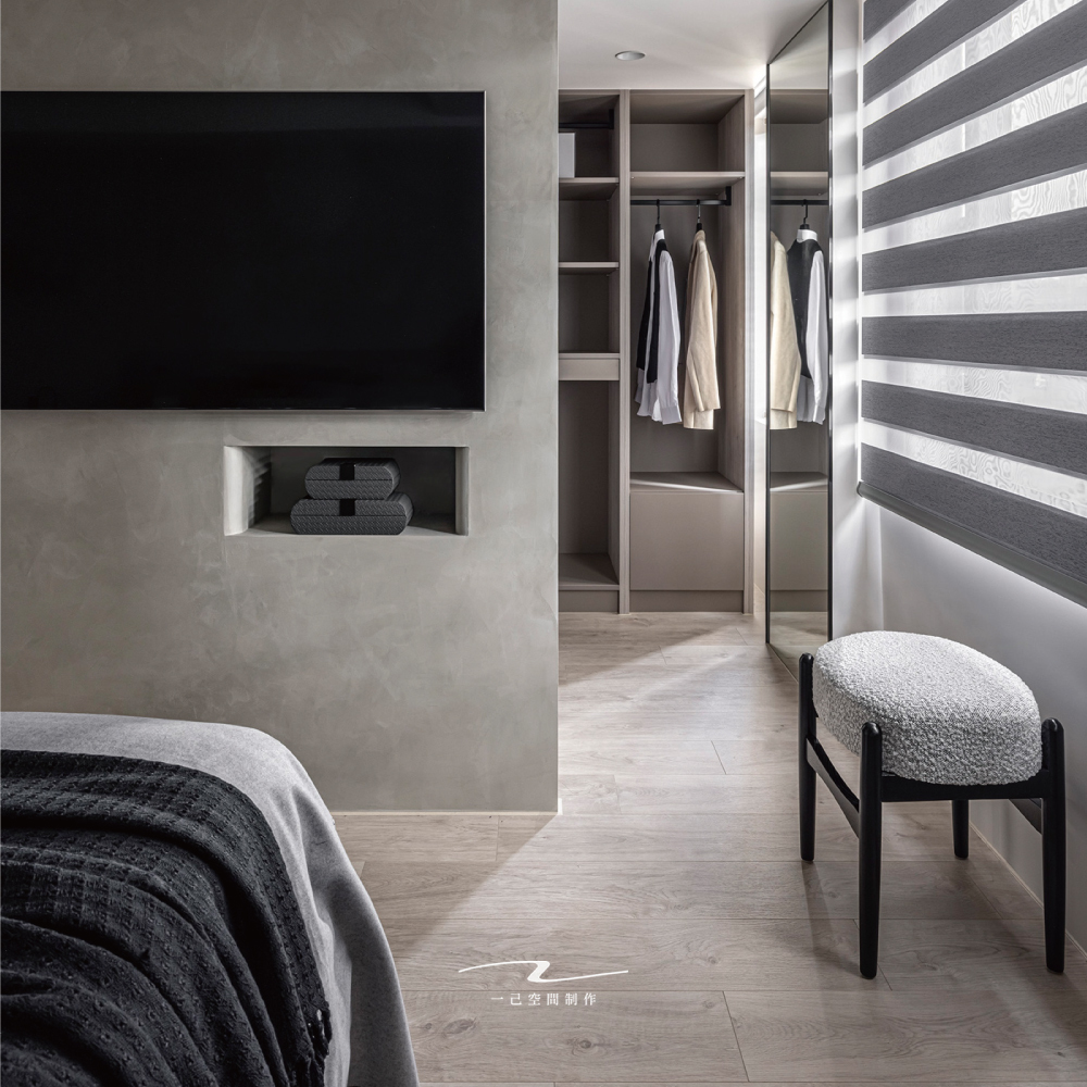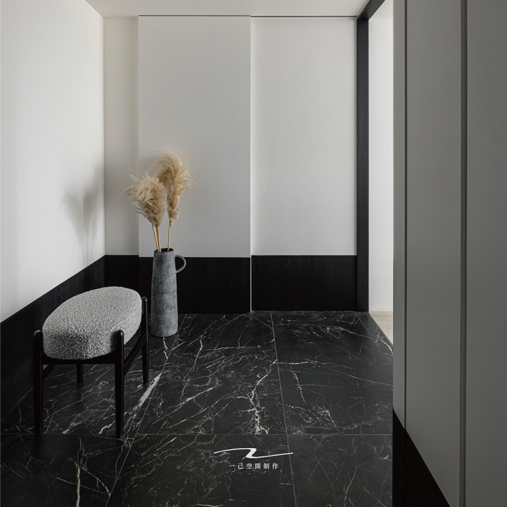 玄關搭配不可少的椅凳,撞色設計簡約呈現。
