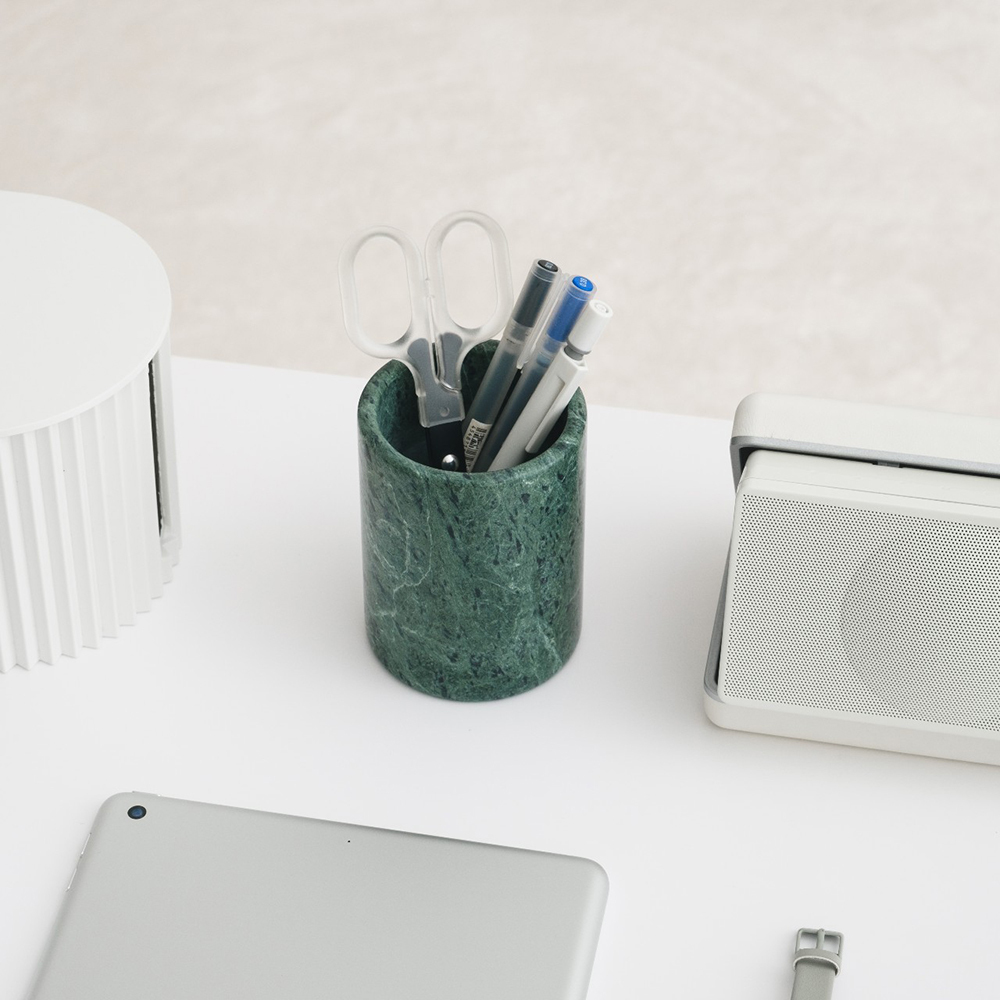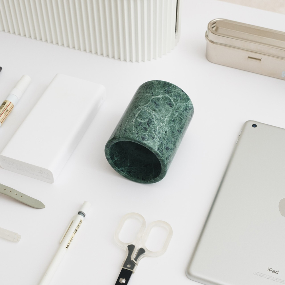 天然石材筆筒圓潤厚實 沉穩綠色紋理帶來自然氣息