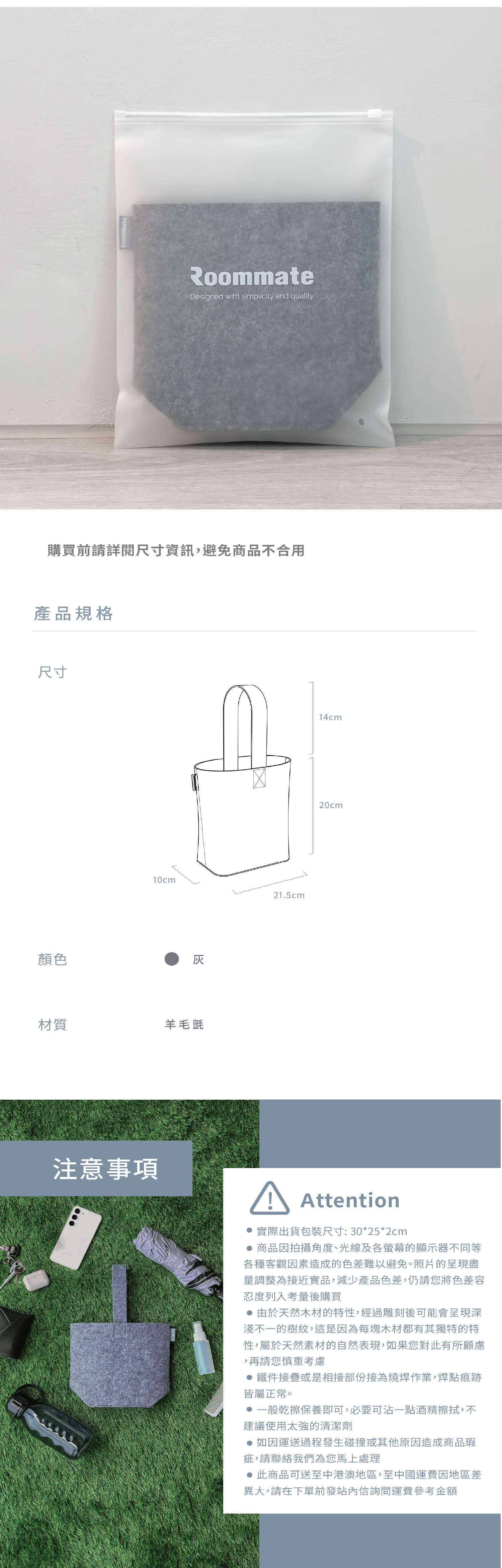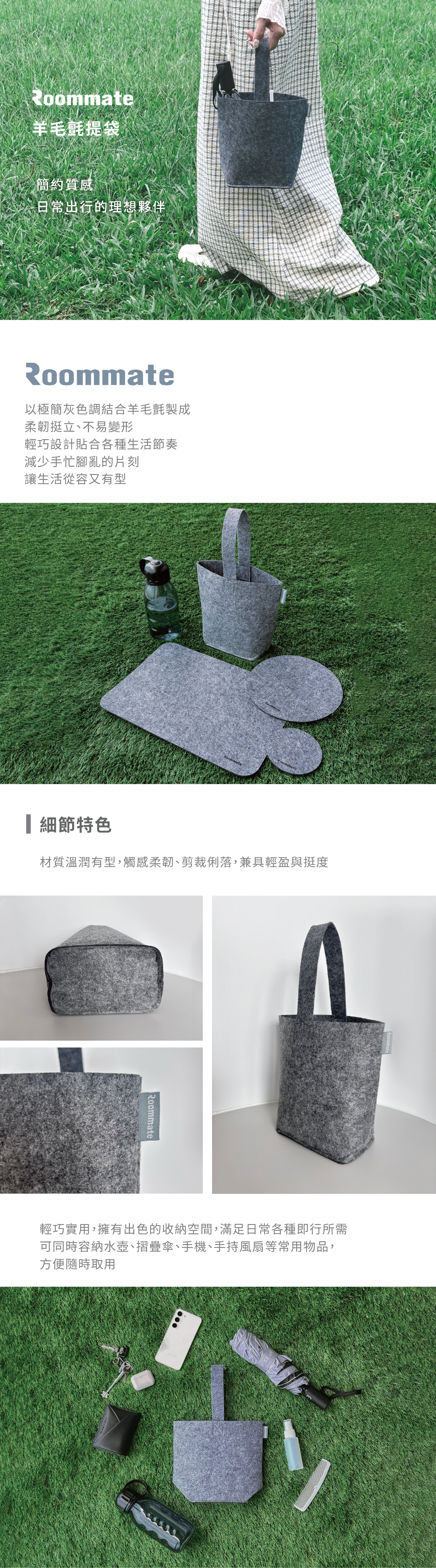 臨時攜帶手機、鑰匙、隨身小物,Roommate羊毛氈提袋都能輕鬆應對
