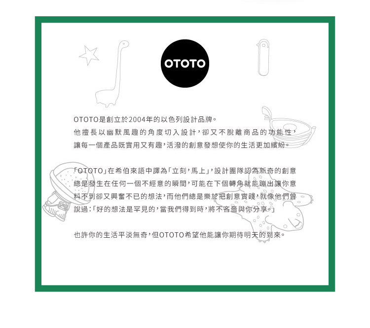 「OTOTO」在希伯來語中譯為「立刻,馬上」,設計團隊認為新奇的創意總是發生在任何一個不經意的瞬間,可能在下個轉角就能蹦出讓你意料不到卻又興奮不已的想法,而他們總是樂於把創意實踐,就像他們曾說過:「好的想法是罕見的,當我們得到時,將不吝嗇與你分享。」