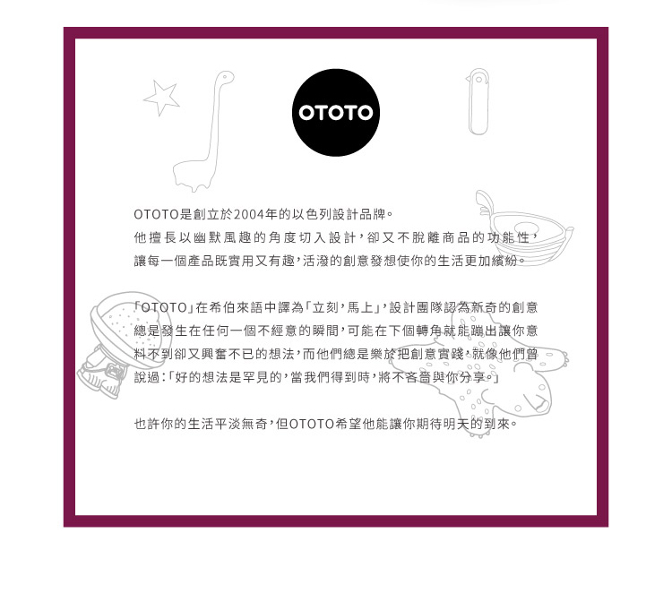 「OTOTO」在希伯來語中譯為「立刻,馬上」,設計團隊認為新奇的創意總是發生在任何一個不經意的瞬間,可能在下個轉角就能蹦出讓你意料不到卻又興奮不已的想法,而他們總是樂於把創意實踐,就像他們曾說過:「好的想法是罕見的,當我們得到時,將不吝嗇與你分享。」