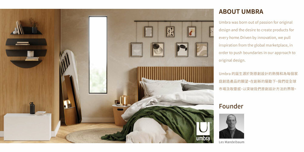 如今,Umbra 行銷全球 120 多個國家,並在歐洲、美洲及亞洲設有辦公室,致力於為每個家庭帶來風格與功能兼具的家居用品。