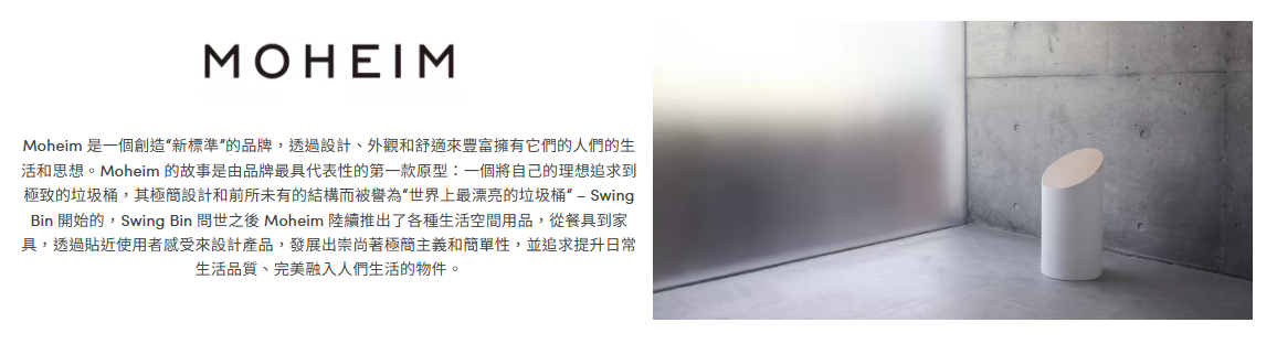 其極簡設計和前所未有的結構而被譽為“世界上最漂亮的垃圾桶”-SwingBin開始的,Swing Bin問世之後Moheim陸續推出了各種生活空間用品,