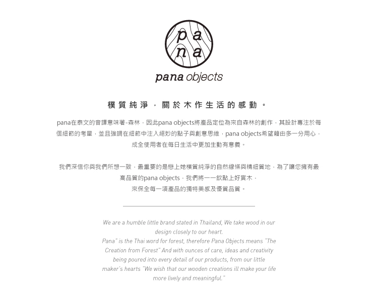 puna-在泰文的音譯意味著森林,因此pana objects將產品定位為來自森林的創作,其設計專注每個細節的考量,並且強調在細節中注入絕妙的點子與創意思維,pana objects希望藉由多一份用心,成全使用者在每日生活更加生動有意義。