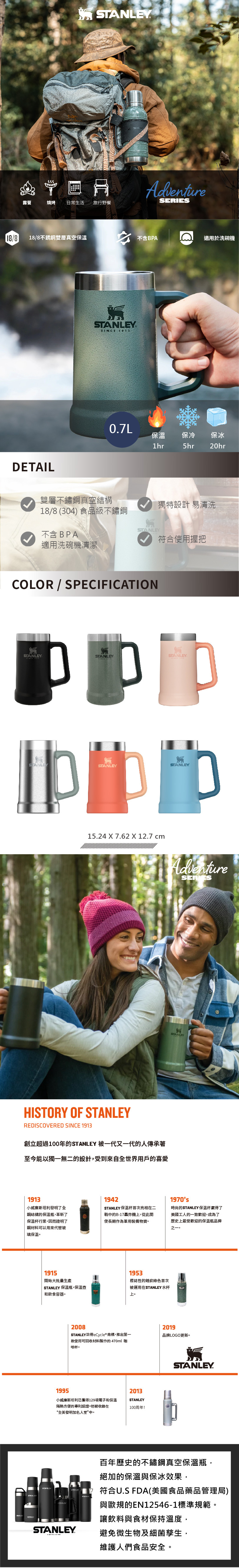 自 1913 年起 STANLEY 就已經成為了無數探險回憶的一部份。從日常生活到旅行,產品都是傳承給下一代的珍貴財富。它們經久耐用並伴隨著難忘的回憶。至今仍然保持著固有的特點—傳奇品質與耐用性。同時將商品細分為從經典到登山系列,完整的食品與飲料裝盛解決方案以滿足任何需求。當您購買 STANLEY 產品後,得到的是專為生活而設計的優質產品。