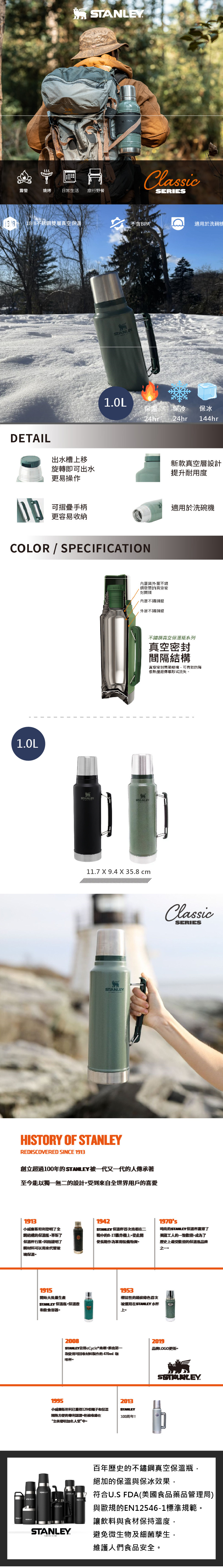 自 1913 年起 STANLEY 就已經成為了無數探險回憶的一部份。從日常生活到旅行,產品都是傳承給下一代的珍貴財富。它們經久耐用並伴隨著難忘的回憶。至今仍然保持著固有的特點—傳奇品質與耐用性。同時將商品細分為從經典到登山系列,完整的食品與飲料裝盛解決方案以滿足任何需求。當您購買 STANLEY 產品後,得到的是專為生活而設計的優質產品。