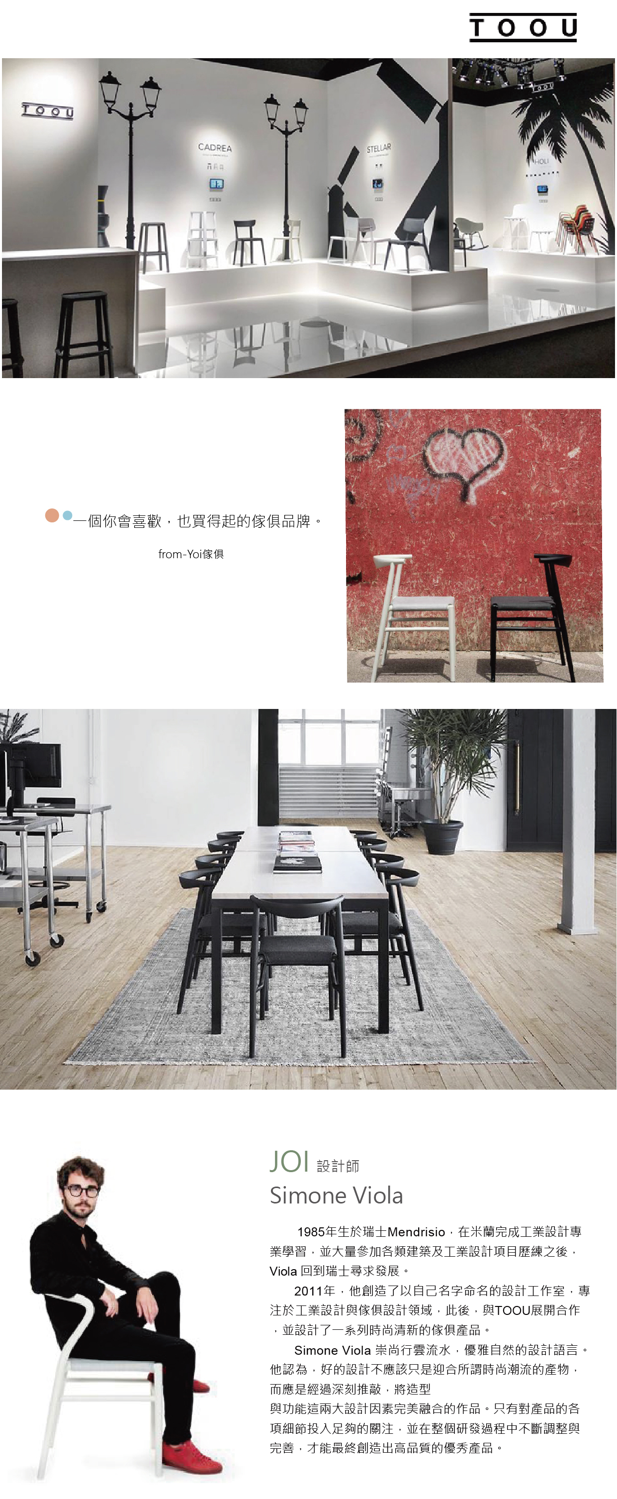 TOOU 是以友善生態為本的義大利品牌,對於材質的選用的,不只嚴謹, 更常以環保自然的材質為主要的重要考量,產品中結合當代美學概念與20世紀設計學院的經典, 共同淬鍊出簡約高品質的產品,擁有獨特的氣質和設計感,且具有極高的辨識度。 不僅是日常生活中搭配的首選,在規劃商用辦公空間也非常合適,是近年來空間設計師非常喜愛及欣賞的品牌。