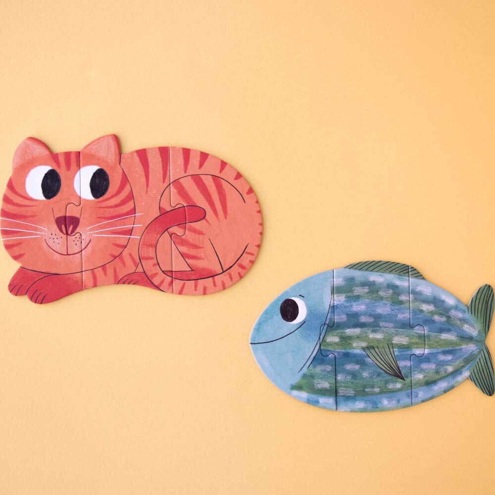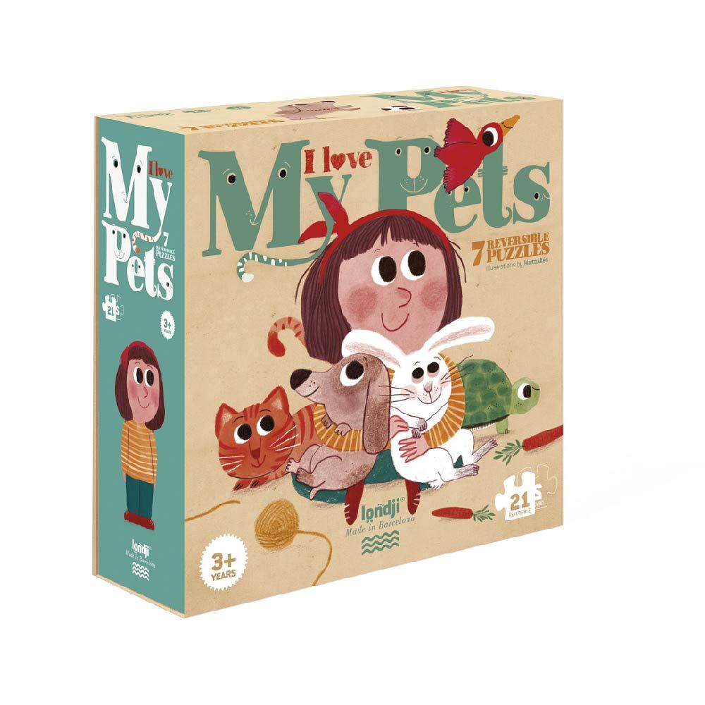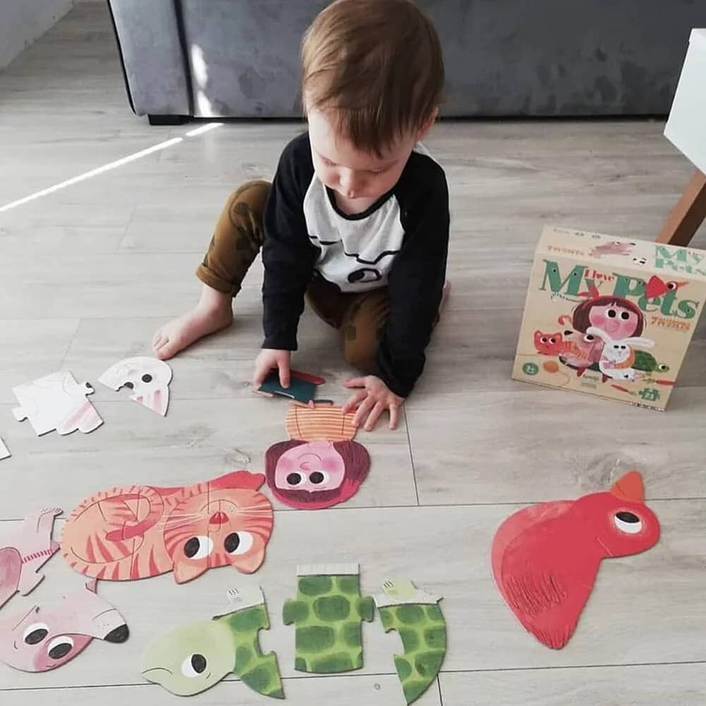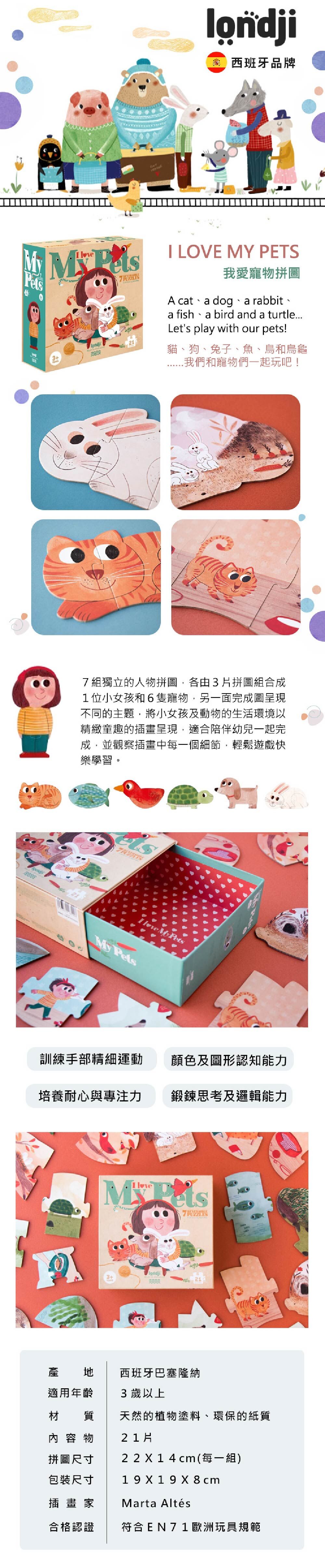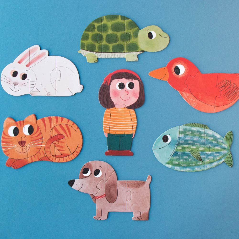由各3片拼圖組成的小女孩與她的各式寵物,