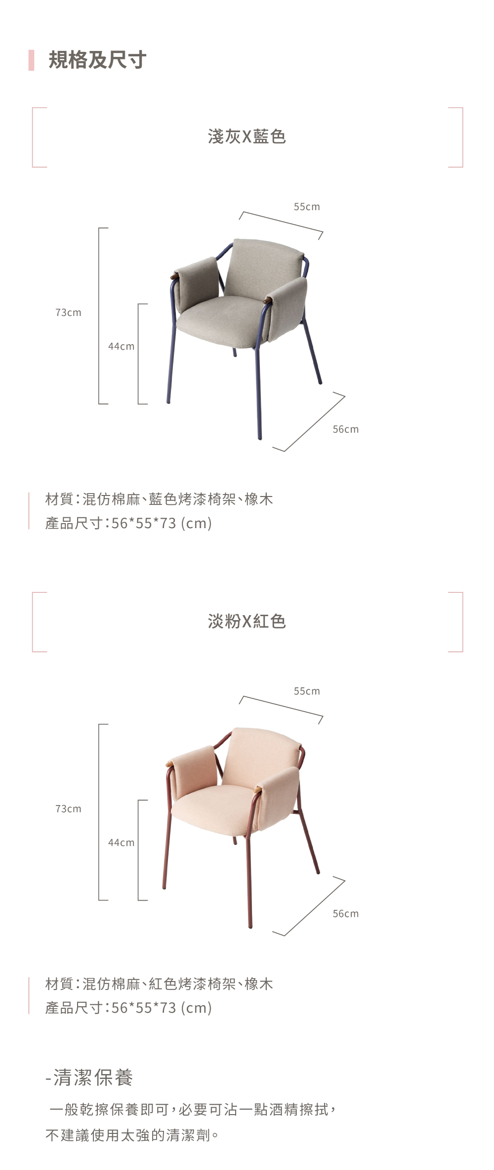 淺灰藍色款&淺粉紅色款:橡木、鐵(烤漆)、混仿棉麻