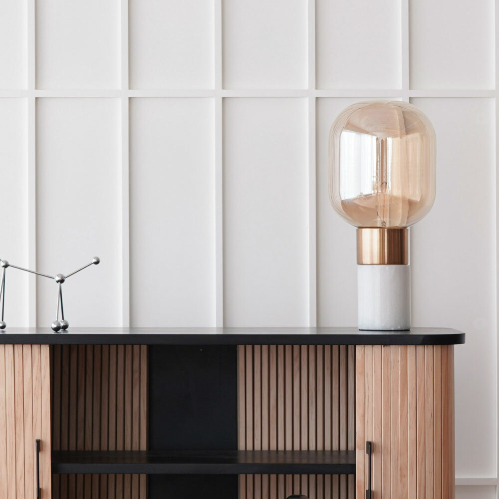 簡約時尚的幾何線條,搭配大理石作為基座,橢圓造型的玻璃燈罩,