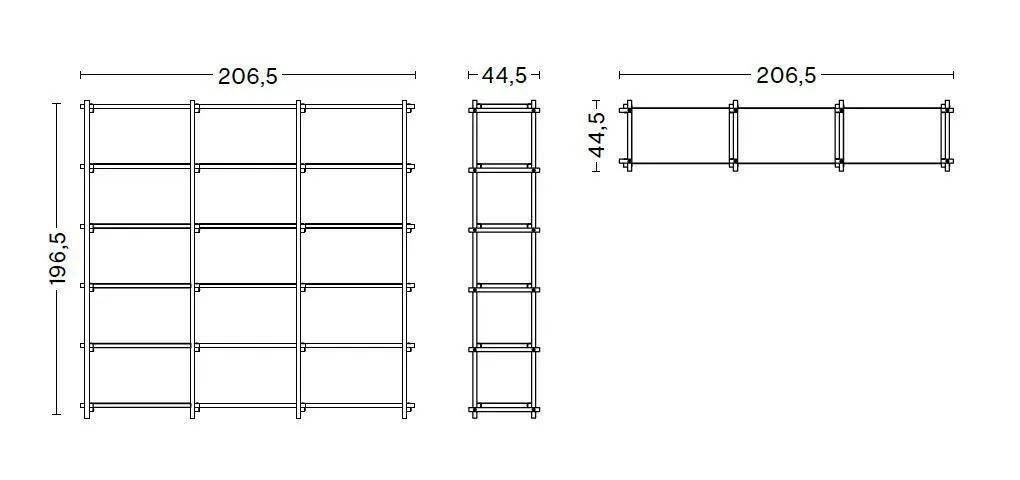 Woody 有不同的尺寸可供選擇,可以用作獨立的層架系統、靠牆放置或作為簡易隔間。