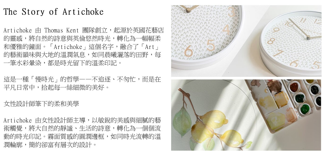 Artichoke 由 Thomas Kent 團隊創立,起源於英國花藝店的靈感,將自然的詩意與英倫悠然時光,轉化為一幅幅柔和優雅的鐘面。「Artichoke」這個名字,融合了「Art」的藝術韻味與大地的溫潤氣息,如同晨曦灑落的田野,每一筆水彩暈染,都是時光留下的溫柔印記。