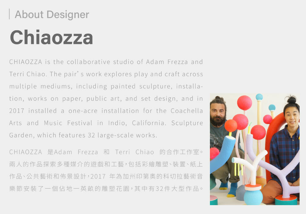 CHIAOZZA 是Adam Frezza 和 Terri Chiao 的合作工作室。兩人的作品探索多種媒介的遊戲和工藝,包括彩繪雕塑、裝置、紙上作品、公共藝術和佈景設計,2017 年為加州印第奧的科切拉藝術音樂節安裝了一個佔地一英畝的雕塑花園,其中有32件大型作品。